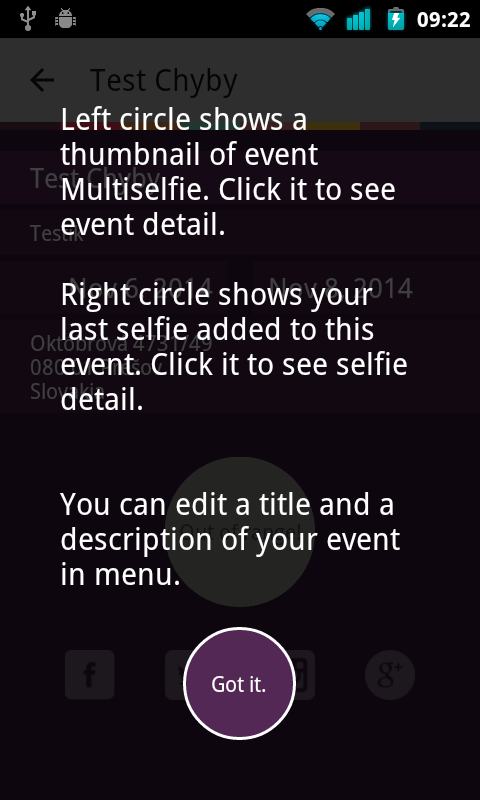 You can create event on your place and in some time and add your selfies and your friends selfies who are in range of this event. You can send your selfies to our server, which make single event multiselfie from all your friends selfies.