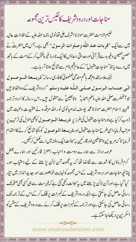 Since long our friends, accomplices, and esteemed readers had been requesting for the online availability of the compilation. Therefore, with the blessings of Allah, the online edition of Munajat-e-Maqbool and this compilation of Durood Shareef has been prepared in a very beautiful and modern layout.