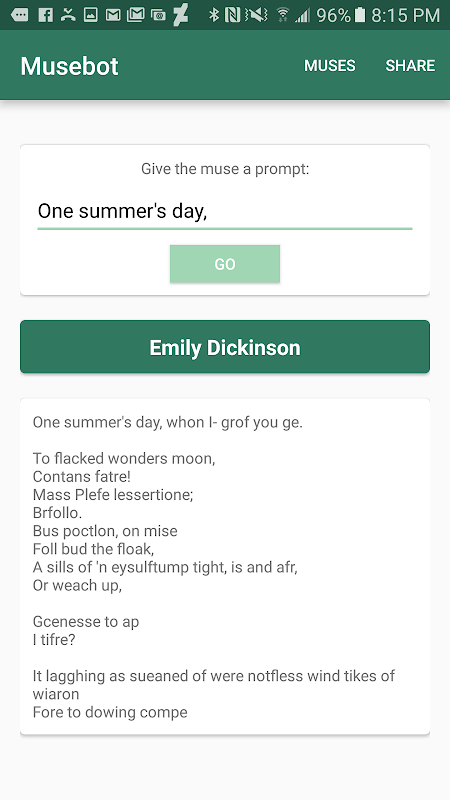 Musebot é um autor em seu bolso. Shakespeare, Homer, Dickinson, e muito mais, gerar texto no estilo único de cada um desses escritores, para o seu entretenimento literário.