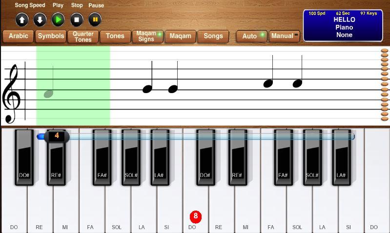 The application of a Music Notes Learning contains two ways to deal with the first application by playing automatically, which is that the application plays the songs play while you only watch, which enables you to understand each tone and its place on the chart, or choose the hand playing where the musical score will stop in the green area, and this method is very important to test the ability of the individual On reading the note and translating it into a hit on the piano keys, which leads to continuing playing