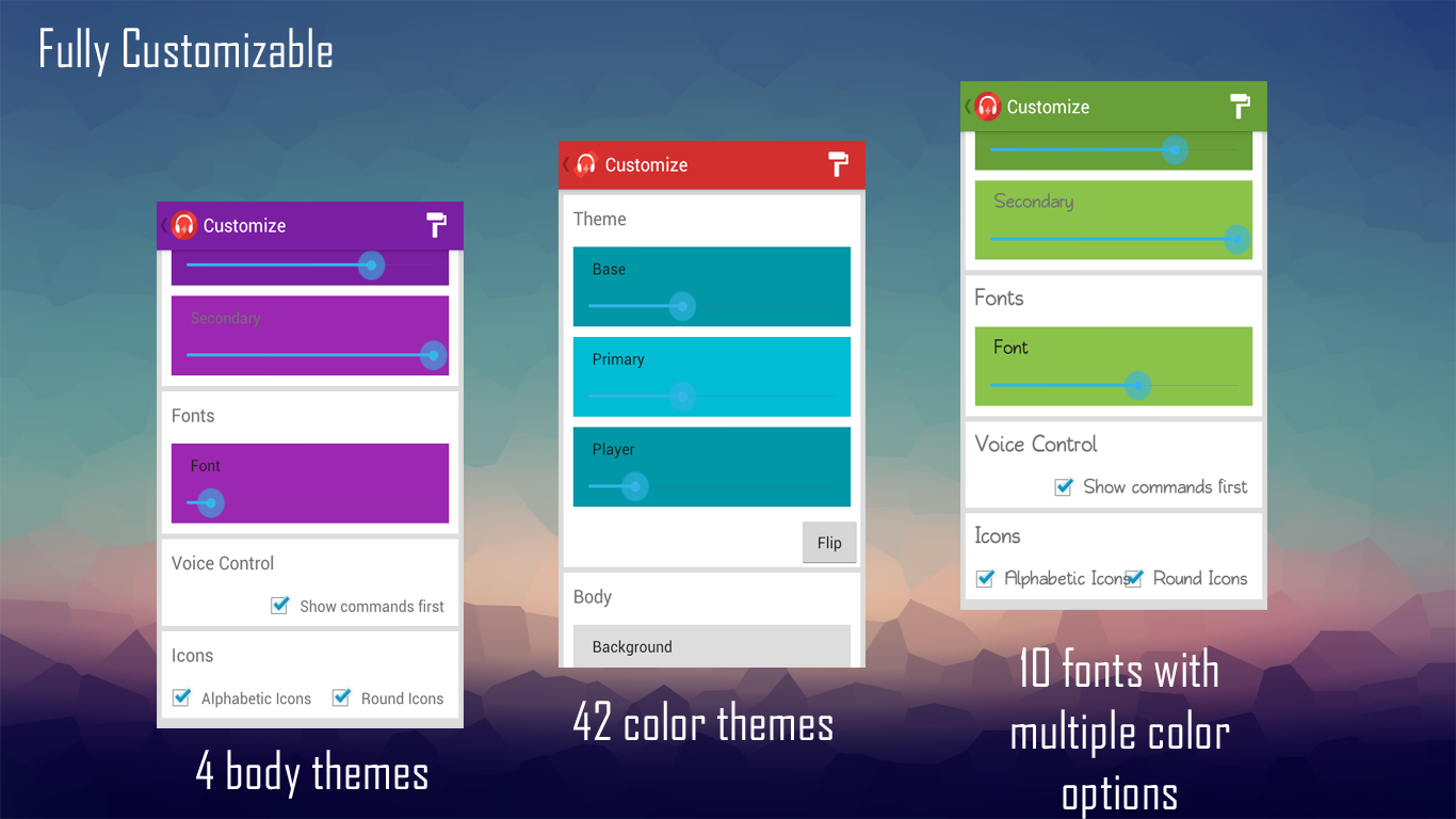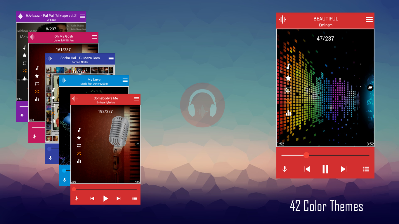★ Music player is fully customizable, it means you will never get bored watching the same old colors every day. You can paint Music Player with your own color taste. It comes with :