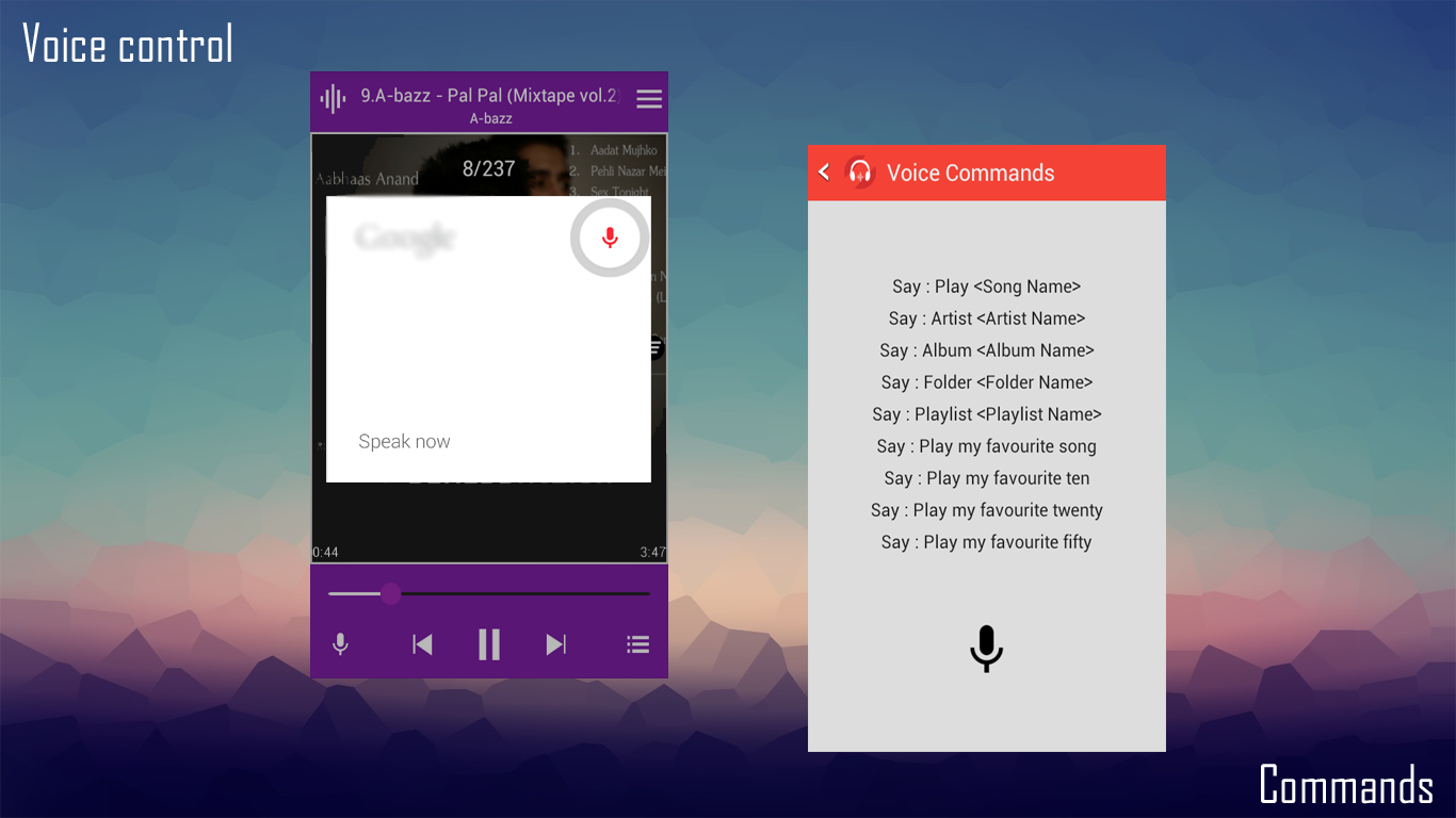 ★ Music player is a future music player , you can give voice commands to the player , some of the commands are :
