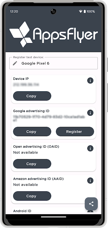 Use o My Device ID para registrar diretamente os dispositivos de teste e testar a integração do SDK do AppsFlyer em seu aplicativo.