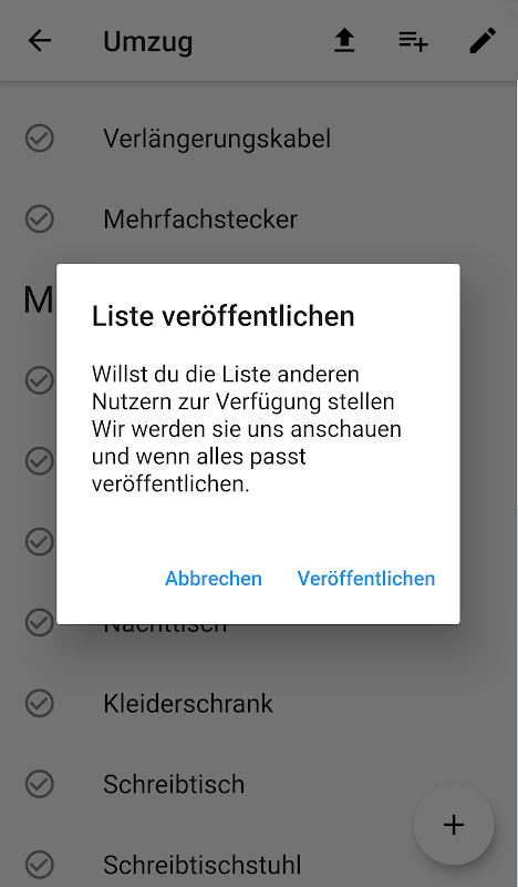 Vielmehr wollen wir Zusammenstellungen mit den gleichen Dingen für euch anbieten, sodass ihr zwar an den ähnlichen Listen arbeitet, aber jeder seine erledigten Dinge selbst abhaken und erweitern kann.