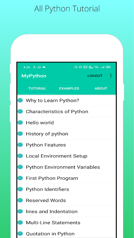 O aplicativo Learn Python do My python é uma maneira mais fácil de aprender Python em movimento. Passe pelo básico e aprenda a codificar desde o primeiro dia. Experimente o aprendizado prático com o conforto do seu telefone. Baixe o aplicativo agora e acesse todas as lições e exemplos de Python gratuitamente.