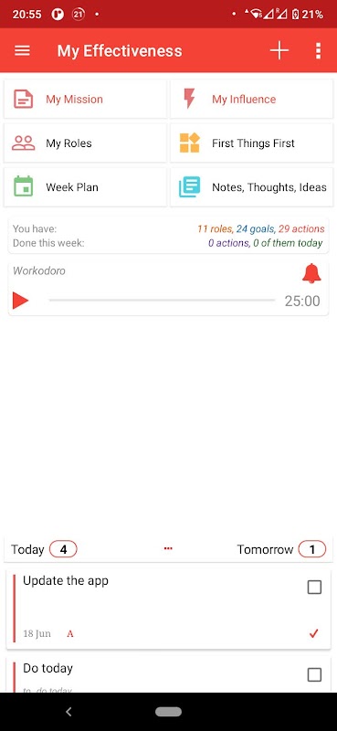 Você pode ter suas tarefas pendentes como uma lista, uma lista de verificação ou um projeto. Para fazer uma tarefa, você pode marcá-la como concluída. Um objetivo geralmente consiste em ações (To Do-s) para alcançá-lo. Você também pode marcar uma meta como concluída. No aplicativo você terá suas tarefas agrupadas por seus papéis de vida. Cada função pode ter vários objetivos.