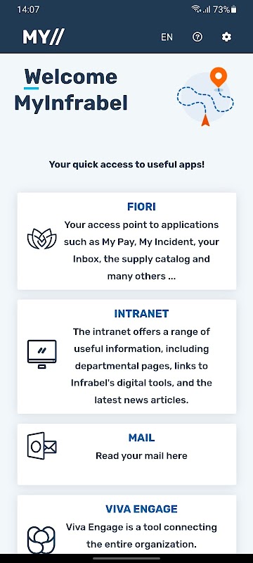 MyInfrabel é um aplicativo destinado aos funcionários da Infrabel e a qualquer visitante no local. Ele tem o objetivo de facilitar o acesso a determinados aplicativos e manter o vínculo com a comunidade do Infrabel durante esse período de bloqueio.