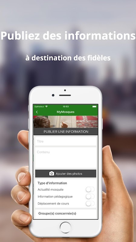 MyMosques est une application mobile moderne et accessible améliorant efficacement la communication entre les différents intervenants dans votre mosquée: Fidèles, élèves, parents, professeurs et direction !