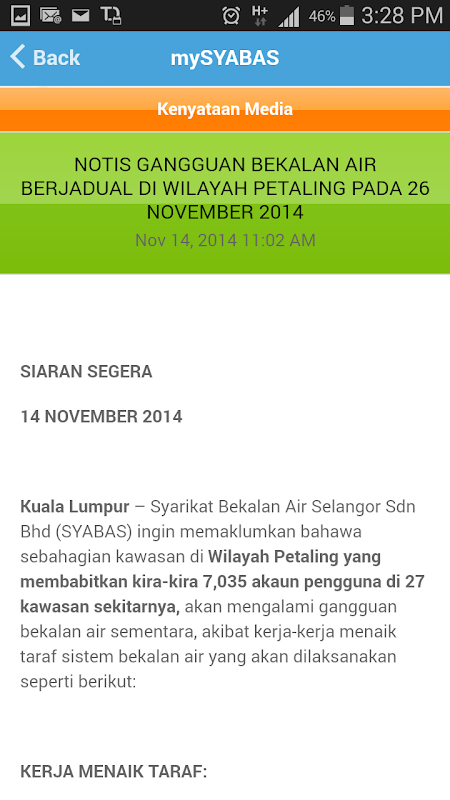 This is an official mobile application from Syarikat Bekalan Air Selangor Sdn Bhd (SYABAS). It is as another information and complaint channel in order to provide better services to water consumers of Selangor, Kuala Lumpur and Putrajaya, in line with todays' technological advancement in Information Technology and Communication. Any complaint submitted through this application will be received instantly by our SYABAS Consumer Service team, to authenticate its validity and to ensure the complaint will be attended.
