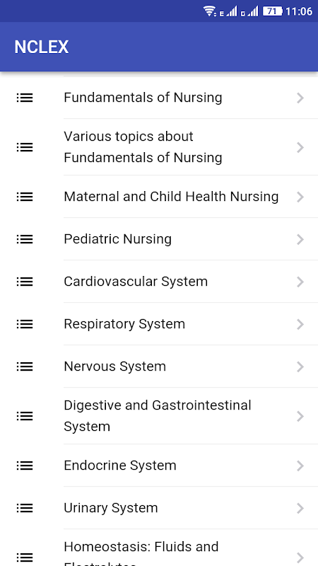 Nós recomendamos que você para tentar responder a todas as perguntas dos exames no aplicativo para ser bem-equipados para o NCLEX. Estes exames irão ajudá-lo a aprimorar suas habilidades de pensamento crítico para que questões parecem familiarizados durante os exames reais. Os tópicos são listados em cada formato de questionário que especifica o que conceitos do exame abrange.