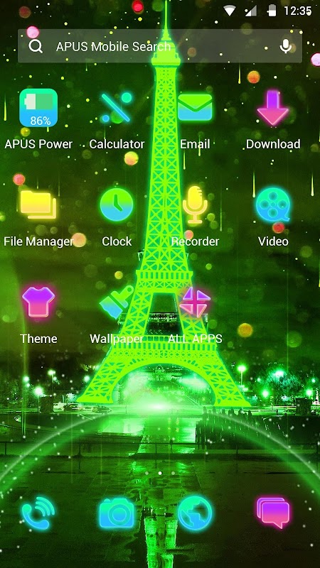 1. Neon Green Eiffel Tower-APUS Launcher theme is free, but only compatible with APUS Launcher. If you want to apply it, please install APUS Launcher on your Android phone. Or download new theme and APUS Launcher. When you install APUS Launcher, there are variety of themes in APUS theme & wallpaper shop, such as phonex, lovely unicorn, pink diamond mickey, Red heart, snoopy, luxury, gold, business, black, simple, magic, comic, football, basketball, cricket, Valentine's Day, New Year, Halloween, Christmas, cute cat and dog, butterfly, dawn theme. Install APUS launcher to enjoy more themes.