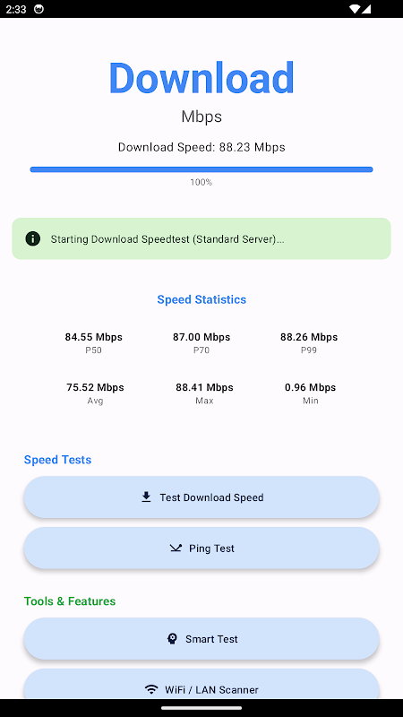 Teste a velocidade de download da Internet, latência (ping), varra LAN / WiFi para dispositivos conectados; tudo isso enquanto consome a quantidade mínima de dados necessária.
