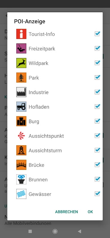 No menu principal, você encontrará uma lista de pontos de interesse classificados por distância de sua localização atual. Um passeio está vinculado à maioria dos pontos turísticos, que você pode acessar na visualização detalhada do ponto de informação por meio do ícone de passeio. Depois de chamar o passeio, o percurso é exibido no mapa e a caminhada ou passeio de bicicleta pode começar. Sua posição é constantemente rastreada no mapa. A distância até o destino é mostrada pelos quilômetros restantes exibidos na parte superior da tela. Se você sair da rota, por exemplo, fazendo uma curva errada, soará um sinal de aviso. Chegar com segurança e tranquilidade ao seu destino não é problema.