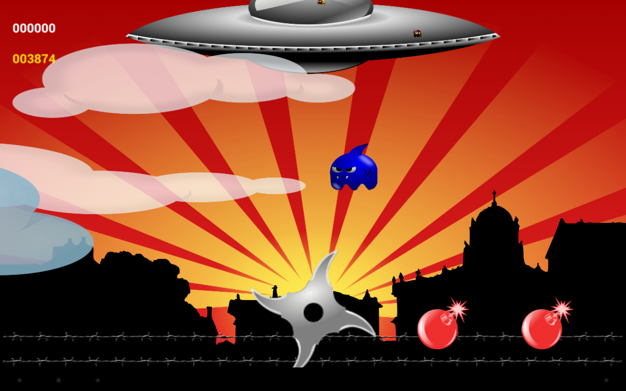 An addictive, annoying casual shooter! You are the Ninja. You throw Shurikens. Aliens are invading. Take em' out using your Shurikens! Watch out for the bombs. If an alien reaches Earth (or a bomb), it's game over. How long can you last as the invasion gains momentum? Getting a high score is not going to be easy on this one!