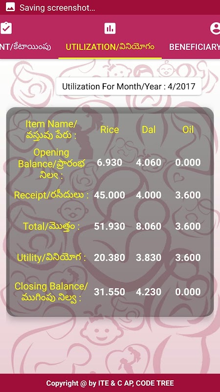 In this user can select District,Mandal,Village and Anganwadi center, based on Above selection we will populate Utilization details of previous month,Allotment Details of Next month, Beneficiary details,Nutrition Information.