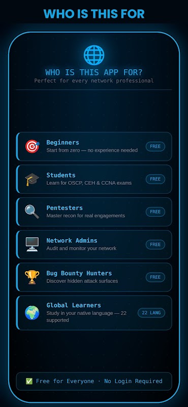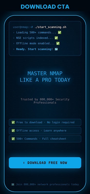 O Nmap Commands é o aplicativo gratuito mais completo para dominar o Nmap e a segurança de redes do zero. Seja você um iniciante ou um pentester experiente buscando as certificações CEH, OSCP e plataformas de recompensas por bugs, este aplicativo abrange comandos Nmap, varredura de portas, detecção de vulnerabilidades e as tendências de segurança cibernética de 2026 em seu próprio idioma, a qualquer hora e em qualquer lugar.