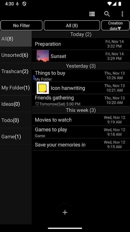 - Classifique a lista de notas por data de criação, data de modificação, data de leitura