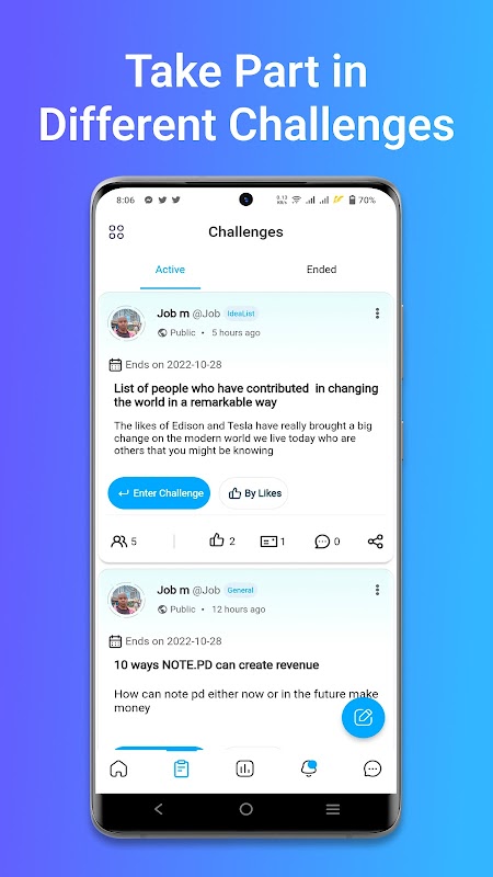 O NotePD oferece desafios que você pode inserir para testar suas habilidades de escrita de lista de ideias em relação a outros usuários. Esses desafios podem ajudá-lo a melhorar suas habilidades, dando a você uma meta pela qual lutar e feedback de outros usuários. Entrar em desafios é uma ótima maneira de se motivar a escrever melhores listas de ideias e melhorar suas habilidades em geral. Então, o que você está esperando? Entre em um desafio hoje!