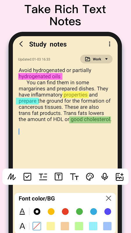 Nosso aplicativo oferece um recurso notável que o diferencia: a capacidade de criar notas codificadas por cores e personalizar formatos de texto. Transforme instantaneamente a aparência de suas anotações ajustando a cor do fundo. Seja memorandos pessoais, tarefas relacionadas ao trabalho ou lembretes importantes, você pode adaptar a cor do fundo para combinar com seu estilo preferido. Leve a personalização para o próximo nível com a opção de formato de texto, permitindo destacar suas anotações com estilos em negrito, sublinhado ou em itálico. E se isso não for suficiente, utilize a função de pesquisa para encontrar facilmente notas específicas por seus títulos.