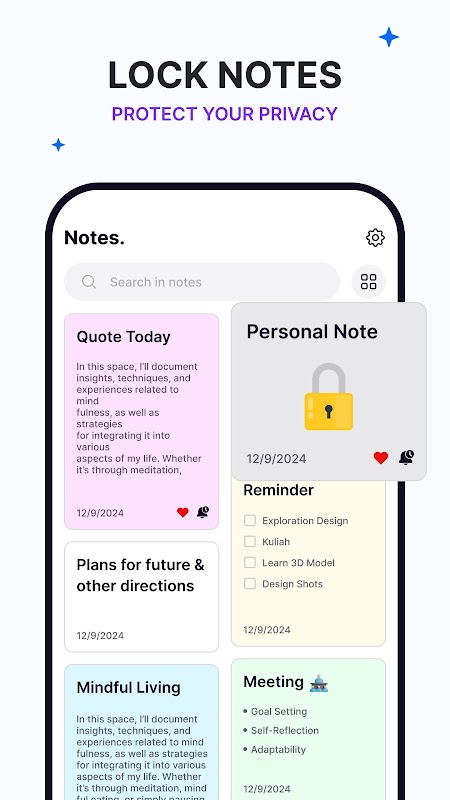🔒Bloqueio de Segurança: Proteja suas anotações privadas com um cadeado com senha.