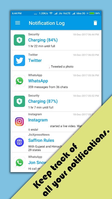 You can check notification logs by date and week also. The notification saving facility provided by this app is unlimited means you can also get notification if it is almost a year old.