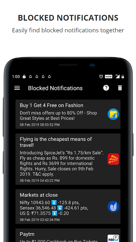 O aplicativo pode ocultar automaticamente as notificações dos aplicativos que você escolher e também salvar a notificação para garantir que você não perca as notificações importantes.