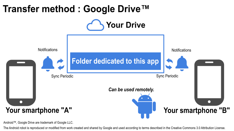 Os métodos de transferência são Bluetooth® ou Google Drive™.