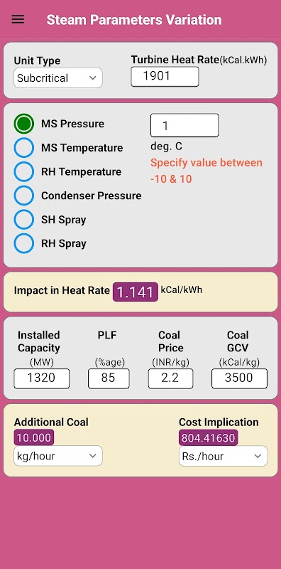 Este aplicativo foi projetado pela NTPC Ltd. (a maior concessionária de geração de energia da Índia) e possui módulos que vão desde a geração de energia convencional até as próximas tecnologias associadas a hidrogênio, amônia, captura de carbono, armazenamento de energia, etc. cálculos de regra de ouro para parâmetros vitais associados a uma usina de energia, como combustível, necessidade de água, emissões etc. e fornece análise de sensibilidade para as novas tecnologias. Este aplicativo pode ajudar as partes interessadas nas atividades do dia-a-dia e fornecer uma ideia ampla para a tomada de decisões usando macroparâmetros e recursos de análise de sensibilidade fornecidos no aplicativo. Esta calculadora de engenharia fornece regras básicas para energia térmica, infraestrutura de hidrogênio, tarifa de usina nuclear, variações de temperatura do vapor.