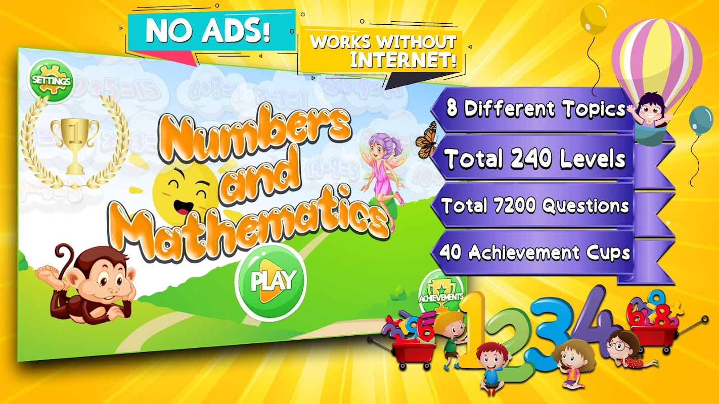 Numbers and math games in 8 different topics, 240 different levels, 7200 different questions are available.