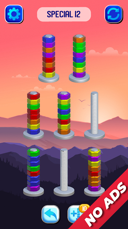 Tente classificar as nozes coloridas no parafuso até que todas as cores estejam no mesmo parafuso. Conforme você avança pelos níveis, logo descobrirá que existem muitos desafios ocultos ao longo do caminho.