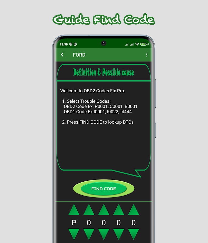 * Selecione o veículo -> Selecione o código -> Pressione o botão Localizar -> Veja a definição e as possíveis causas.