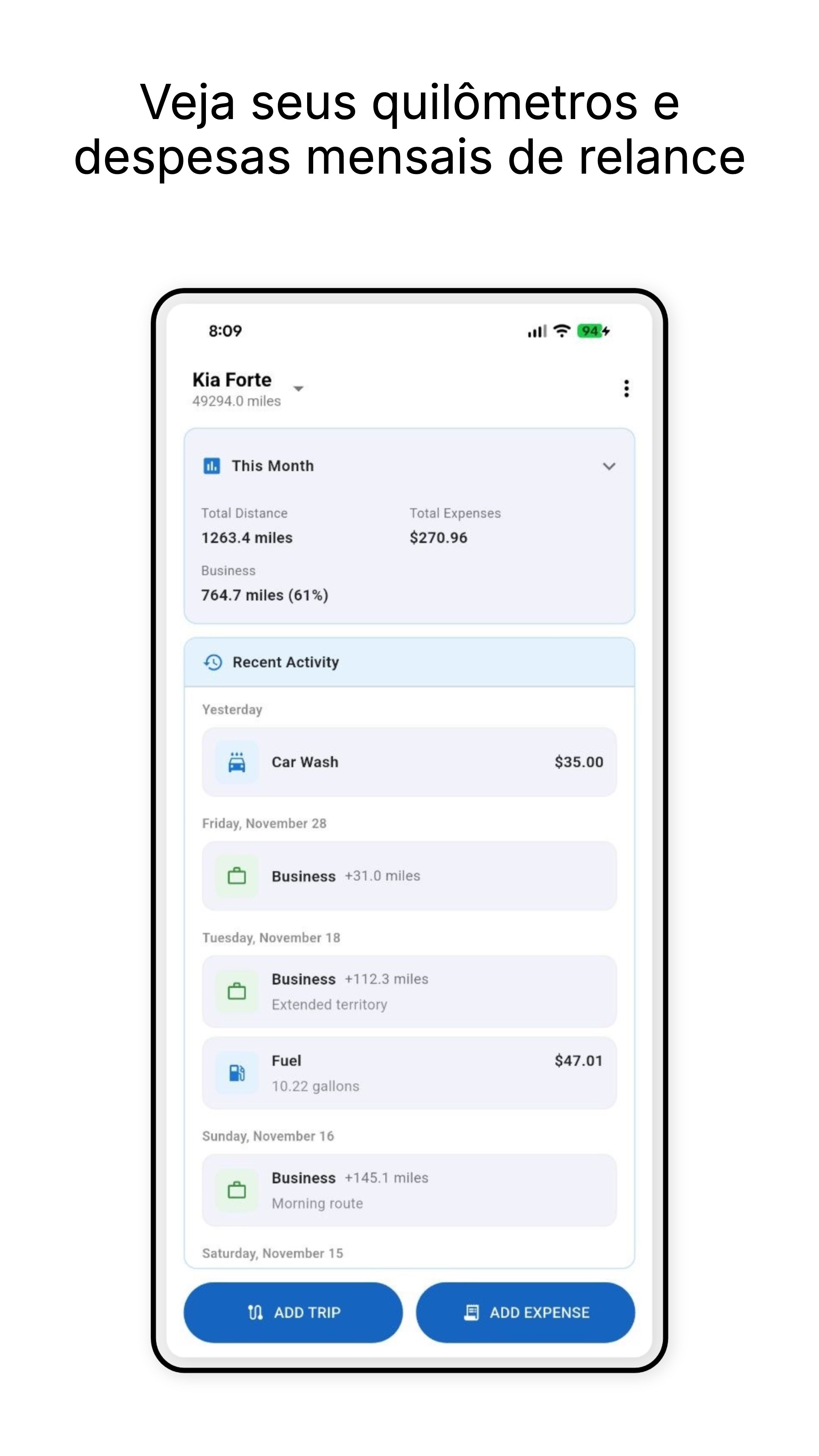 Veja de relance os quilómetros totais, a divisão trabalho/pessoal e as despesas.