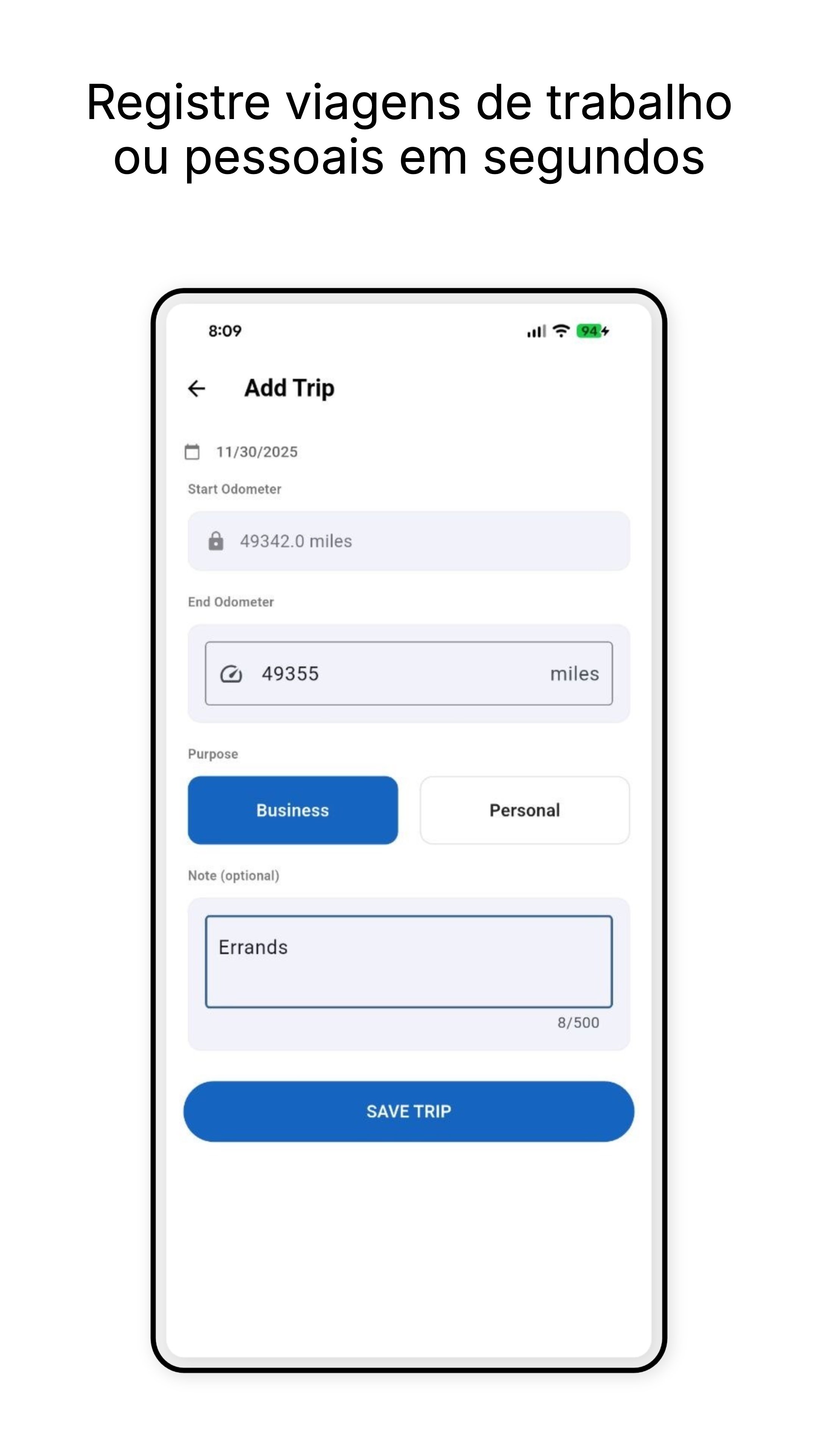 Introduza as leituras do conta-quilómetros de início e fim. O Odo calcula automaticamente a distância. Marque as viagens como trabalho ou pessoais com um toque.