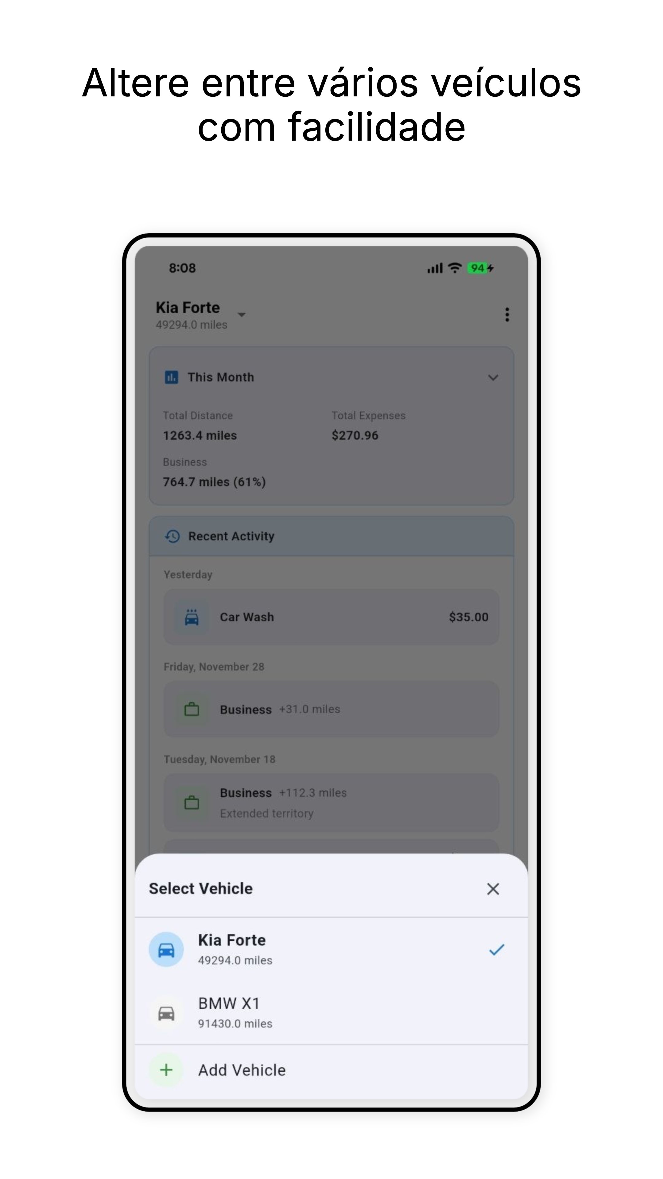 Registe quilómetros e despesas de todos os seus carros ou veículos de trabalho num só lugar.