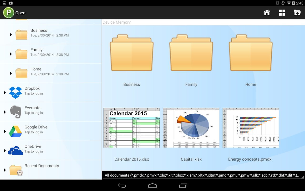 Pode salvar localmente ou na nuvem: o PlanMaker HD pode abrir e salvar planilhas em seu tablet Android, mas também na Dropbox, Google Drive, Amazon Cloud Drive, Evernote e OneDrive.