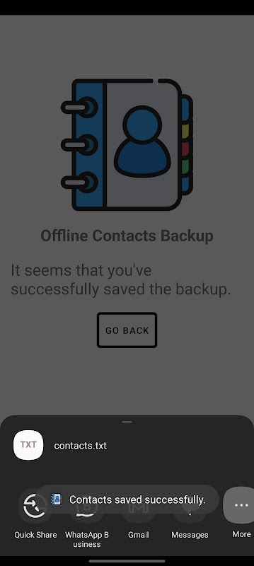 - Compartilhamento automático: compartilhe facilmente seu arquivo de backup de contatos com outras pessoas ou salve-o no armazenamento do seu dispositivo para maior segurança.