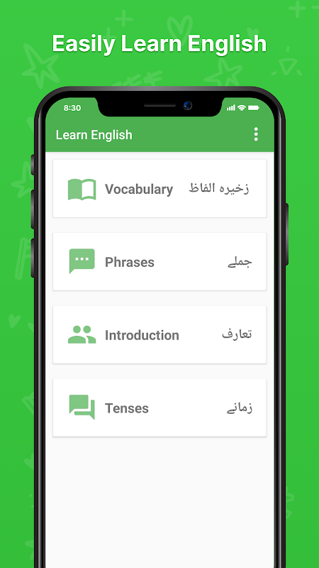 O aplicativo de tradução de inglês para urdu com urdu para todas as idades contém 26 caracteres e aproveite o colorido de A a Z. Aproveite a melhor coleção de aprender inglês do aplicativo urdu para todas as idades. Nesta atividade, você gostaria de ouvir o som de uma coisa feita com o alfabeto (como o A de Apple). Você pode facilmente usar o aplicativo Best learning English.