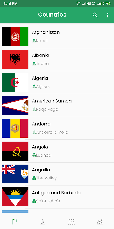 World Atlas is made with almost 250+ country information like capital, the country flag and a pointer to wiki to know more about the free country map.