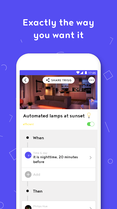 Experimente o seu futebol ou outros esportes ao máximo, piscando as luzes e tocando uma música quando seu time marca. Ou coloque sua casa no modo de suspensão com ativação por voz. E fique do lado seguro piscando as luzes em vermelho quando o alarme disparar. Mas não para por aí, você pode rastrear e acionar ações com base na localização externa. Você define as regras, Olisto faz acontecer.