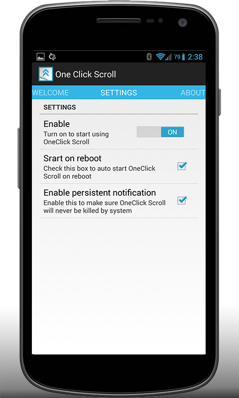This app can come in extremely handy when you in a situation that you want to quickly return to top of a list or a web page. No more tedious swipe up through a long list when OneClick Scroll is installed. All you need to do is to Tap on the top left corner on statusbar. To scroll directly to bottom, just Tap on the top right corner on statusbar. The placement of the scroll triggering area is carefully designed to avoid distraction and confusion. So you can just install and leave it there. It is so transparent that you won't even notice its existence until you need it.