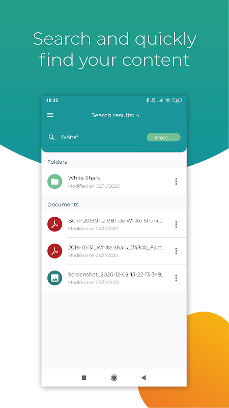 • Salve seus arquivos, fotos e vídeos, arquive-os diretamente de seu smartphone ou tablet e compartilhe-os com seus funcionários, clientes e fornecedores