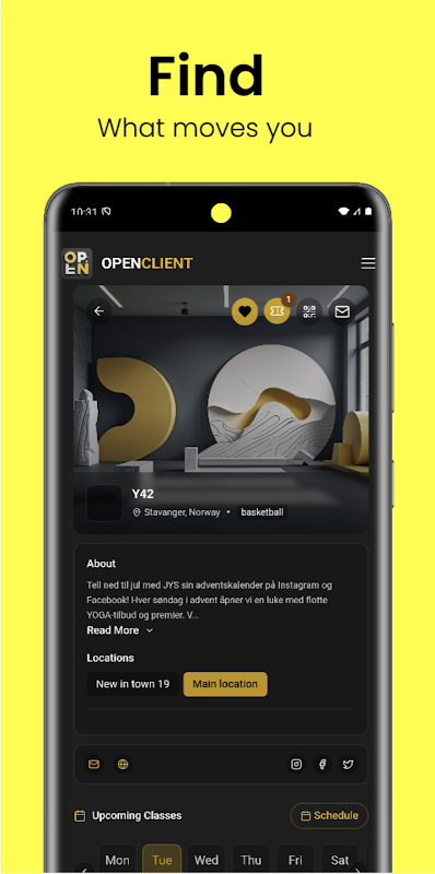 O aplicativo Open Client permite que você descubra academias, estúdios de ioga e pilates, escolas de dança e artes marciais ao seu redor.