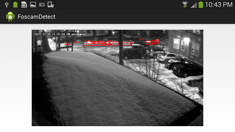 This app uses the BackgroundSubtractorMOG algorithm from OpenCV's android library to identify objects in motion from the camera and draws a red overlay around/over them. The ideal is to have nice contours drawn around the objects that are moving. A slider is also added for the user to adjust the learning rate, which may or may not have any effect on the contours.