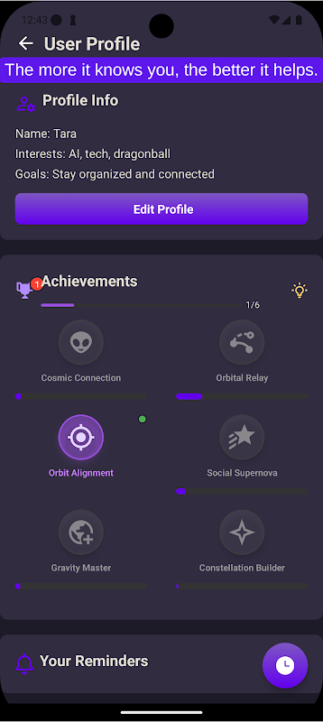 O Orbit-AI lembra das coisas importantes para que você não precise se preocupar. Você receberá lembretes automáticos e até mesmo mensagens sugeridas com base na sua última interação, preferências pessoais e datas especiais. De mensagens de aniversário sinceras a acompanhamentos significativos, o Orbit-AI tem tudo o que você precisa.