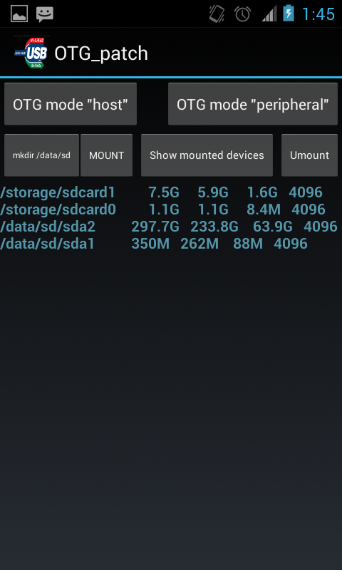 1. After loading of the application, it is necessary to change OTG operation mode for connection of an external disk, for this purpose it is necessary to press the OTG mode host button. Create the directory for assembling by means of the "mkdir/data/sd" button. It is possible to connect an external disk or the USB stick further if it it wasn't made yet, and to press the Mount button then on the screen the attached devices will appear. For an output of more detailed information it is possible to use the Mounted button. After completion of operation with external drives we switch-off them on means of clicking of the Umount button.o
