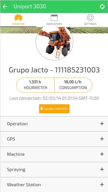 • Monitoramento - Monitore suas máquinas em tempo real, visualizando informações do motor da máquina, dados da pulverização ou da colheita, clima, operação, alarmes e eventos, além da possibilidade de visualização da localização da máquina. (Disponível somente para máquinas Jacto com telemetria)