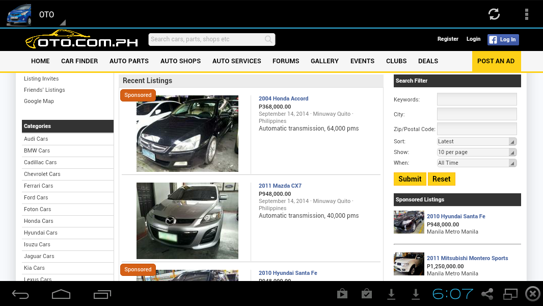 OTO.com.ph aims to become the premier one-stop shop for everyone’s car needs including the following: * Listing of almost all car brands, makes and models (e.g. Ford, Honda, Kia, Hyundai, Isuzu, Mitsubishi, BMW, Ferrari, Porsche, etc.) * Buying, selling, and swapping of brand new or used cars or parts (you are given an option to sale at an auction) * Directory of auto shops (new and notable are also featured) * Garage services (repair, body and detailing, painting, washing, air conditioning, upholstery and more) * Rentals (search for the package or rate that suits your needs from various rental agencies) * Insurance (liability, collision, comprehensive, personal injury and other coverage) * Financing (find the best financing institution to help you own a car) At OTO.com.ph, we also provide an online community where you meet and interact with people who share the same interests. We have forums (a discussion board for auto topics), events (where one can post details, invite friends, and even sell tickets), and clubs (where you can introduce your auto club and gain attention). Plus, we have a dedicated social networking site where you can create your own profile, upload and share cool photos and videos, chat with online members, and write and share reviews. Go ahead and feel free to take a tour and discover how we are able to answer all your car needs. "We connect car enthusiasts, car dealers and auto shops in the Philippines."