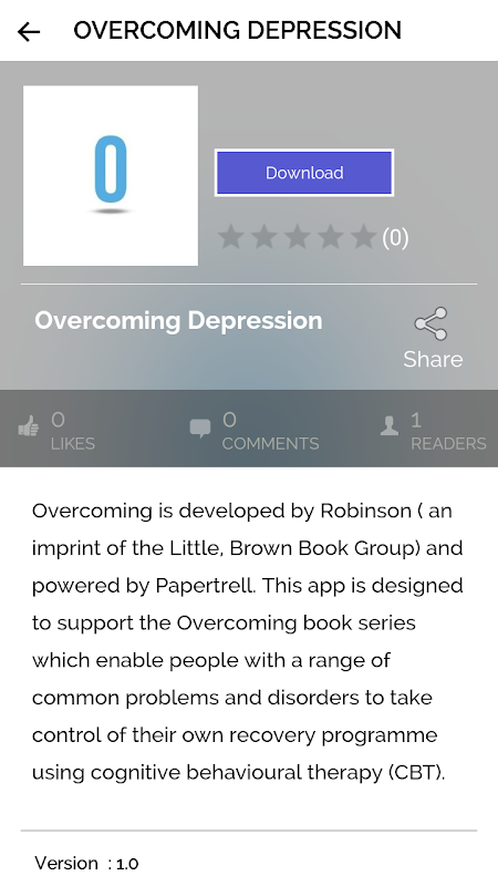 Superando a depressão dá-lhe o apoio que você precisa para ver o seu caminho através da depressão e humor baixo. As escalas de autoavaliação ajudam você a determinar se você tem um problema com a depressão. Ferramentas simples ajudam você a controlar seu próprio programa de recuperação usando terapia comportamental cognitiva (TCC). Um catálogo on-line oferece leitura recomendada para depressão e esses livros podem ser comprados como e-books para uso no e-reader interno do aplicativo.