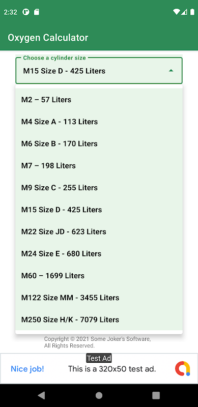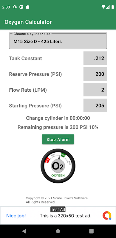 A Calculadora de oxigênio calculará o oxigênio restante deixado em um cilindro de oxigênio com base no tamanho e na pressão restante em PSI. Além disso, um temporizador/alarme pode ser configurado para alertá-lo quando você atingir uma quantidade predefinida de oxigênio reserva.