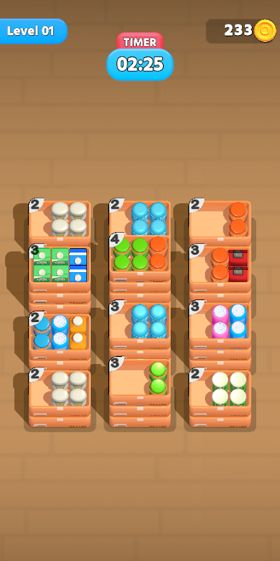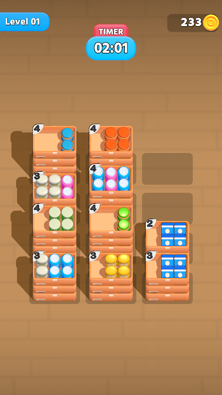 O Packs Sort é um jogo de quebra-cabeça em que você arrasta e solta caixas na mesma camada para classificá-las e limpar o nível antes que o tempo acabe.